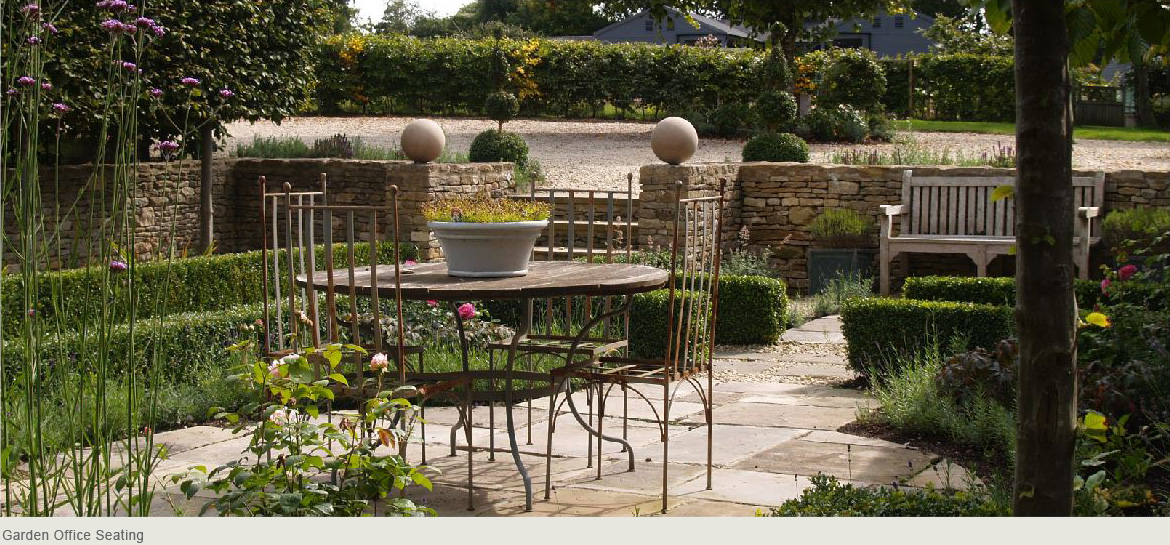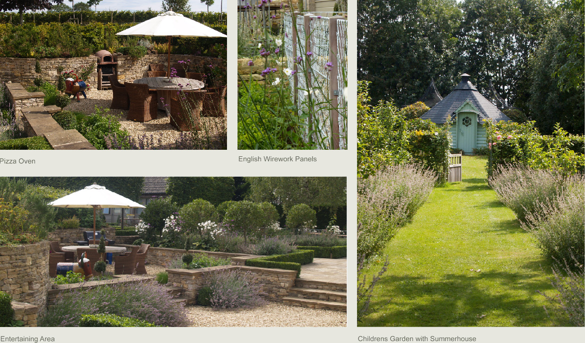 This award winning garden around the recently renovated home and gardens near Cirencester won the award for the best barn conversion in the South West 2012. We designed and built the warm and contemporary garden around a converted barn. Using structural planting and Cotswold stone walls we divided the existing blank canvas of a garden into a series of rooms, these included a space for outdoor entertaining with a dining terrace and pizza oven, fire pit seating area, water lily pond, kitchen garden, fruit cages and an orchard leading to the children's garden with summerhouse.